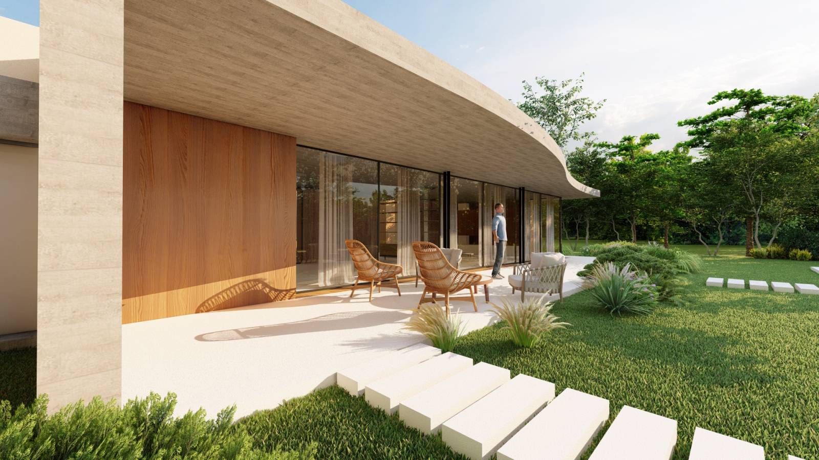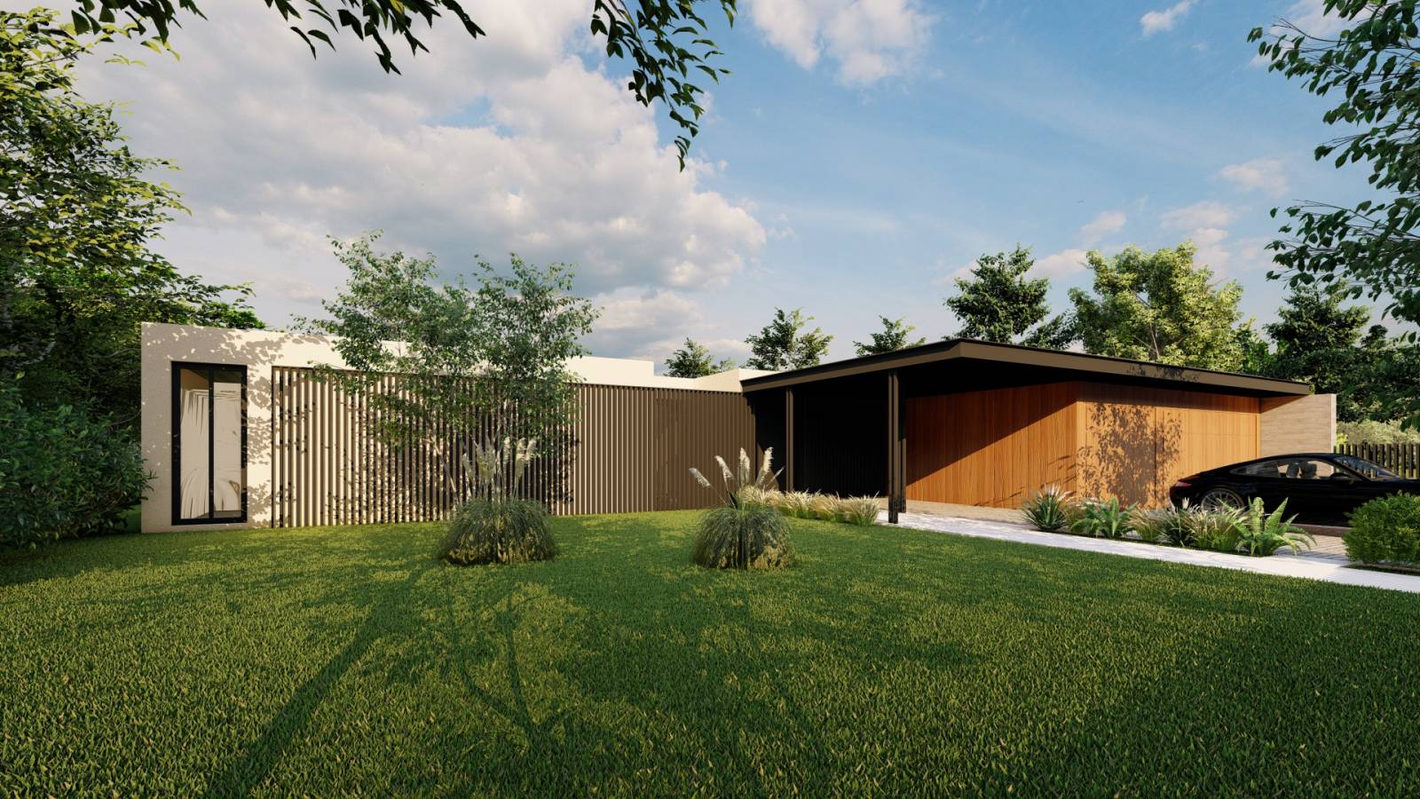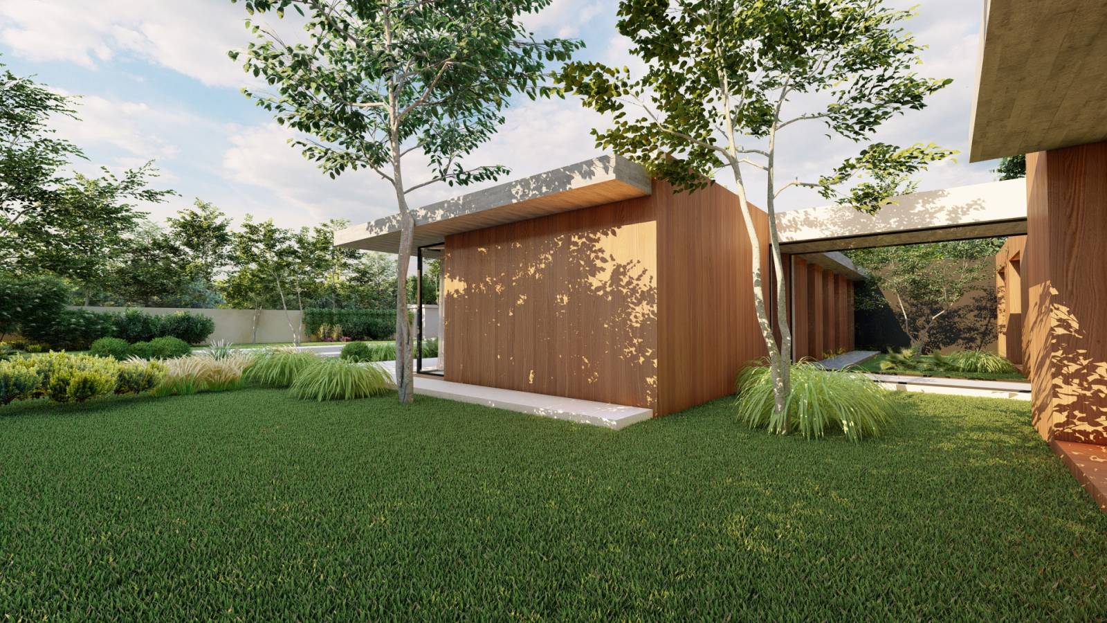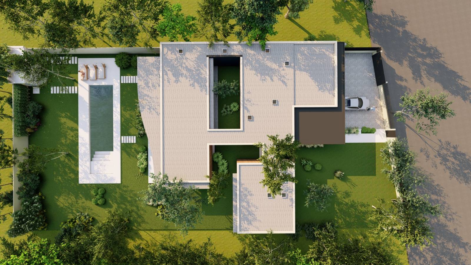 Afin de créer un environnement boisé au plus près de la maison, la casquette du toit a été percée pour pousser les arbres. A l’avant de la maison, se trouve la partie nuit avec deux chambres enfant et une suite parentale avec deux chambres ; la partie arrière constitue l’espace de vie et donne sur le jardin et la piscine.