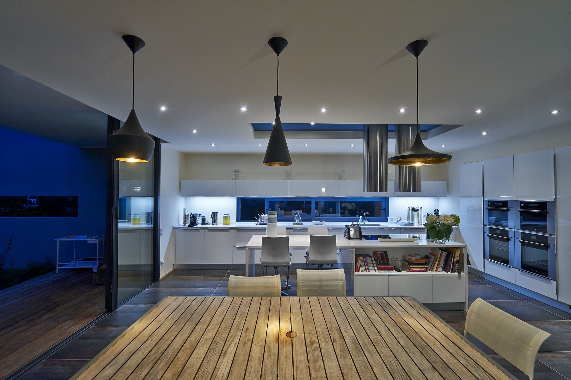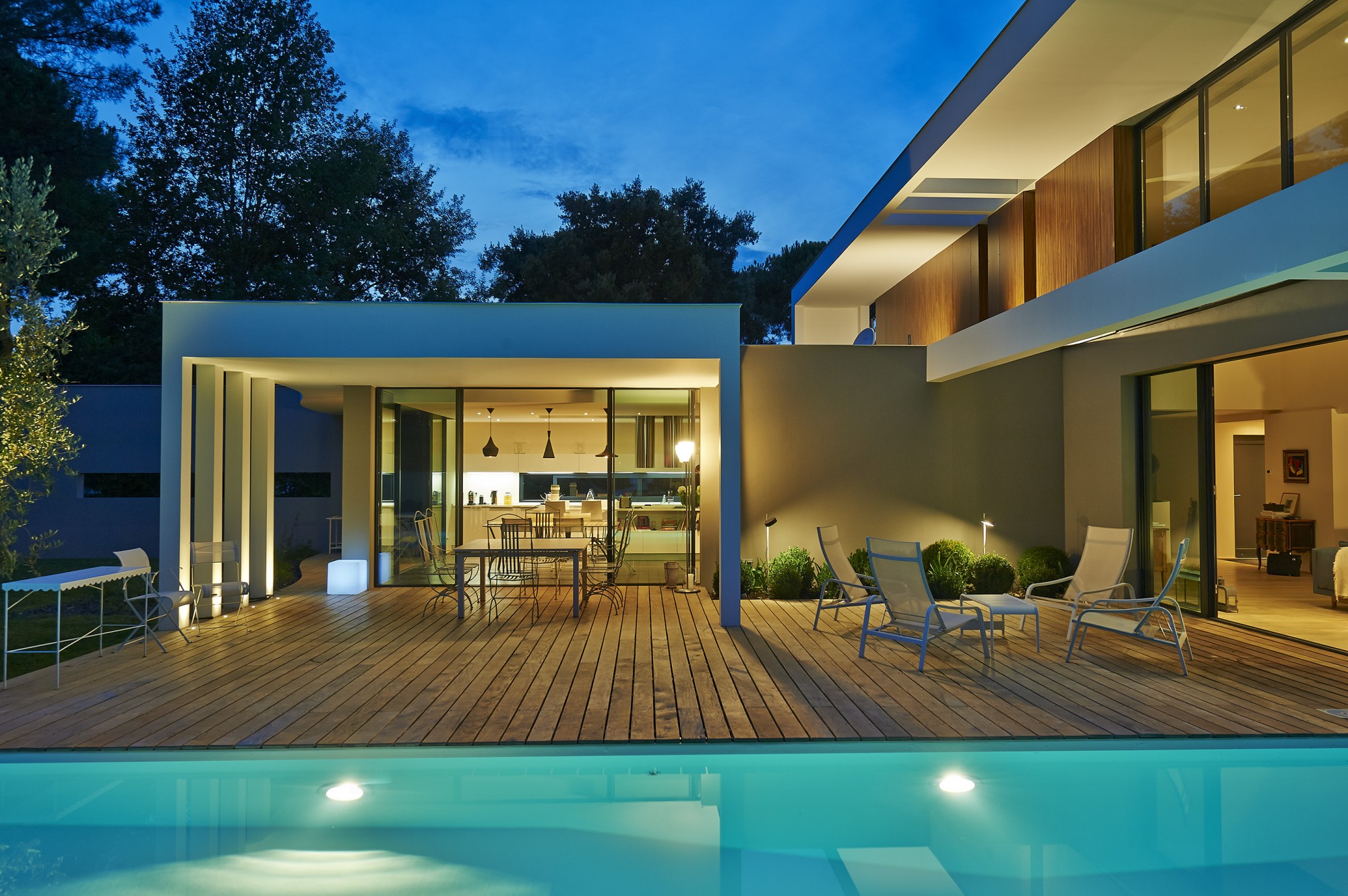 De belles lignes pour une maison contemporaine, de grands espaces destinés aux réunions familiales. Pour ce couple, nous avons réalisé une maison toute en longueur : la surface du salon de 50 m² est identique à celle de la cuisine indépendante. Ces deux pièces entièrement vitrées font face au jardin et à la piscine.
