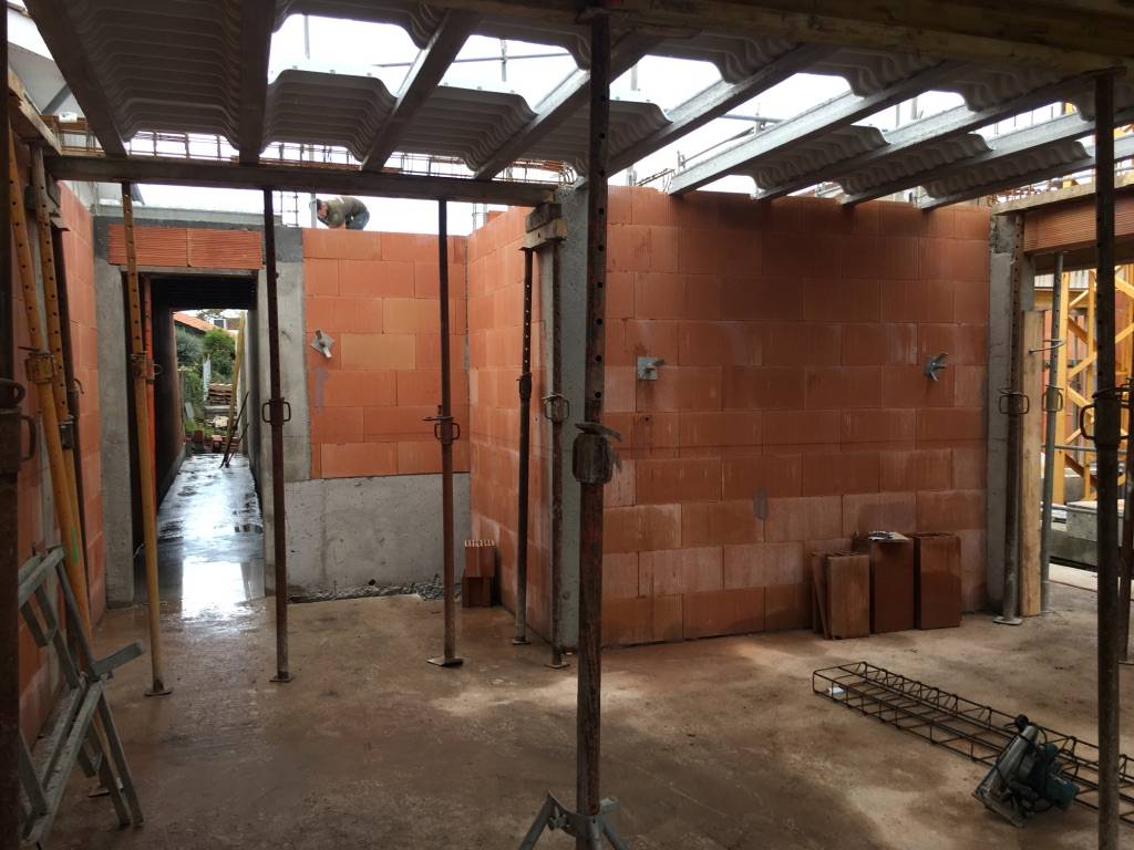 Au rez-de-chaussée ont été aménagés la chambre d’amis, l’espace de vie avec cuisine, salon et coin télé. Le salon en double hauteur avec mur-rideau est protégé du soleil par des panneaux pivotants à la main. Ces deux niveaux bénéficient de patios.