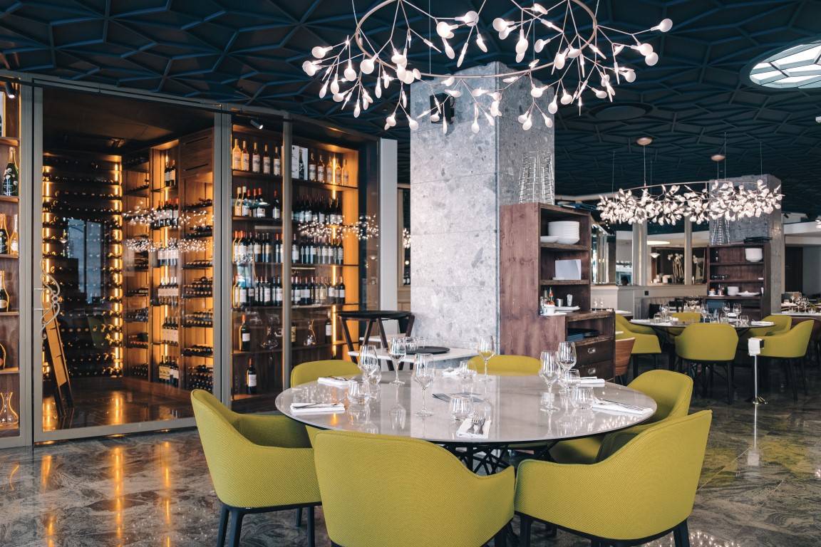 Le plafond a été recouvert d’une structure en bois créant un effet graphique, émaillé de halos de lumière intégrés au plafond et de lustres à pampilles de chez Moooi.