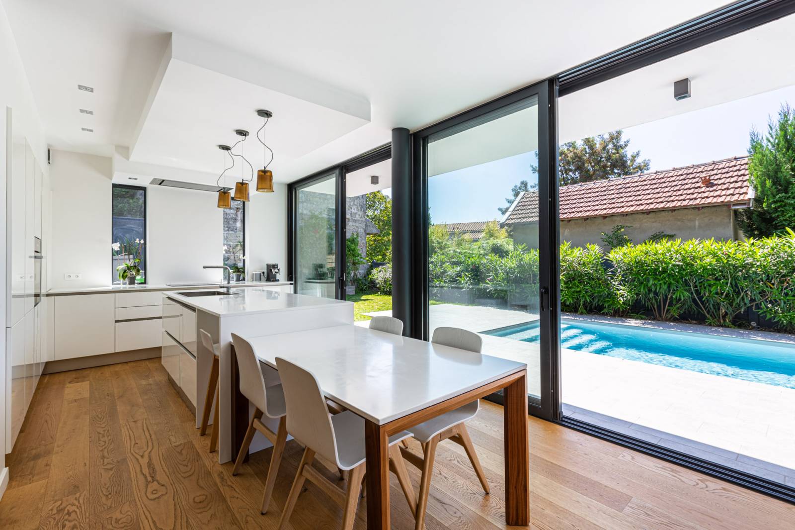 La cuisine, la salle à manger et le salon prolongés d’une terrasse et font face la piscine et ses abords paysagés.