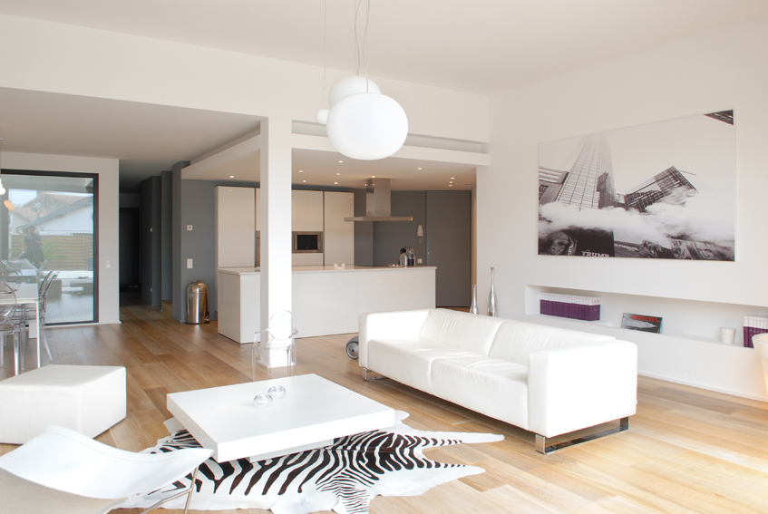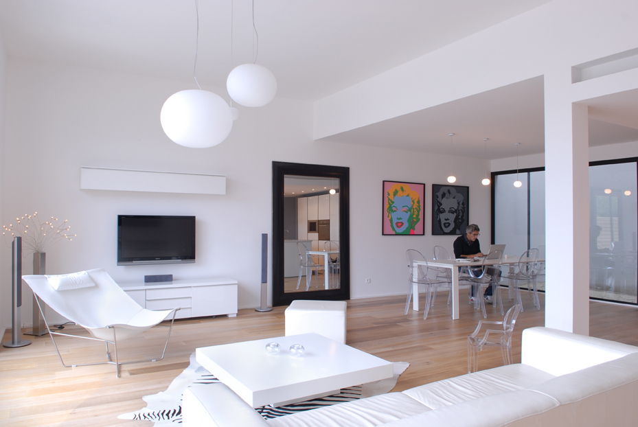 Le salon est équipé d’une baie vitrée coulissante à galandage (les fenêtres se glissent dans les cloisons), qui disparaît et laisse entrer la lumière.