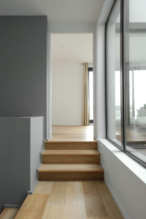 Pour cette transformation, nous avons choisi d’associer le béton, le verre et le bois et misons sur un effet graphique avec un contraste chic entre le béton noir de la façade et un intérieur entièrement blanc.