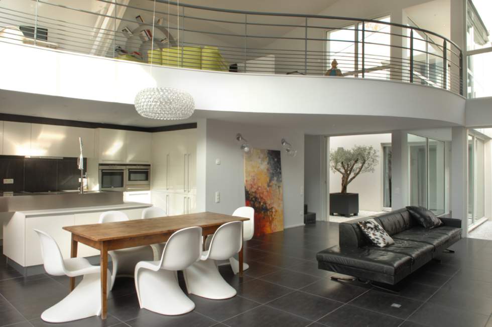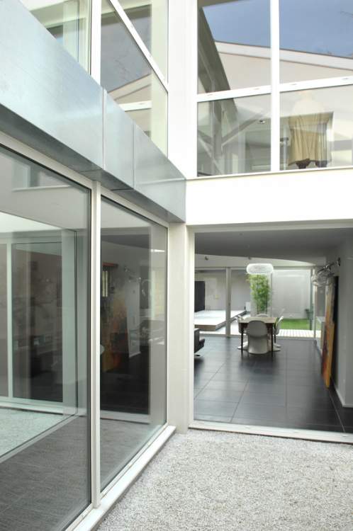 Nous avons créé un patio intérieur afin d’apporter de la luminosité. A l’étage, une passerelle mène à un studio privé.
