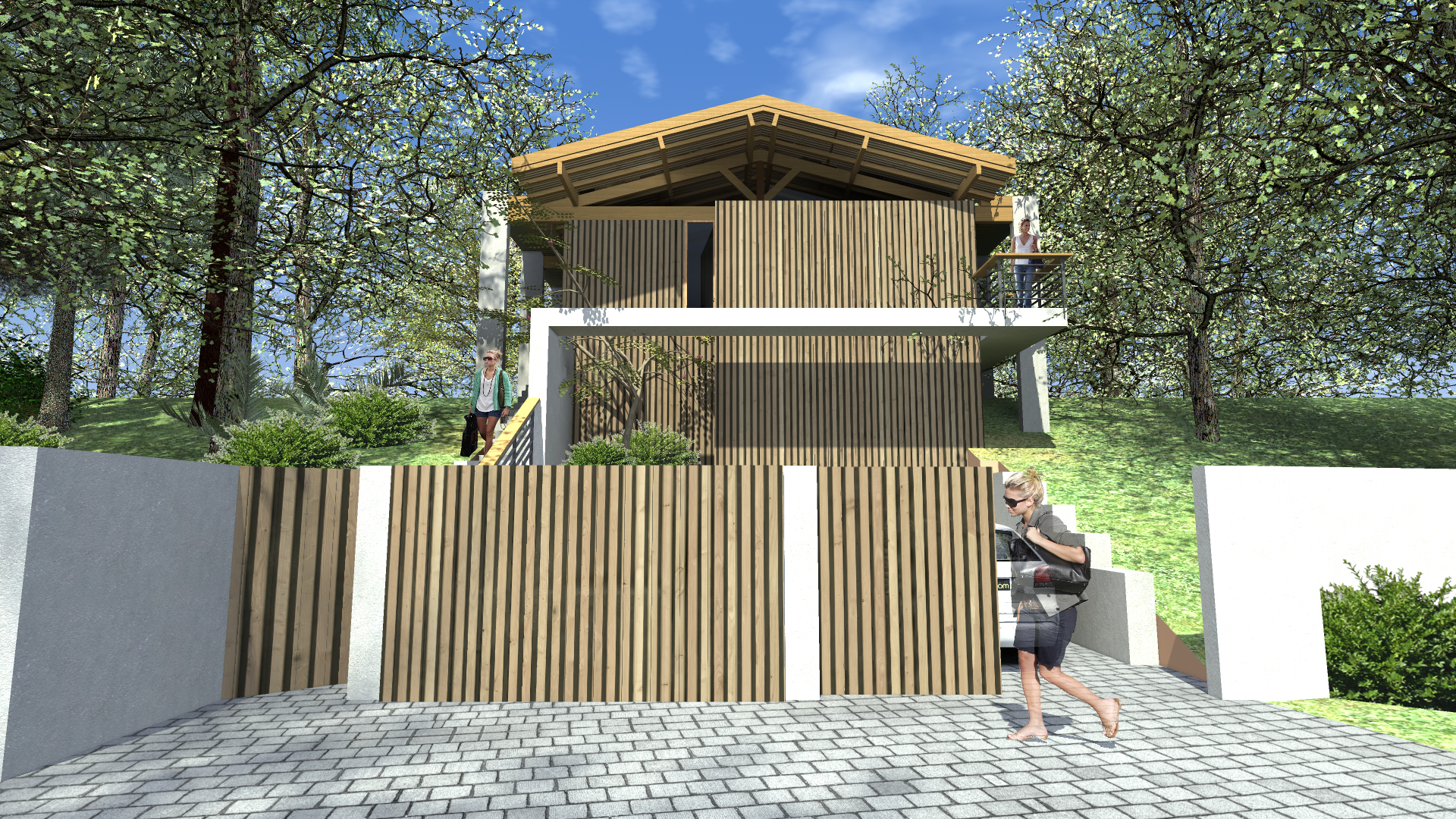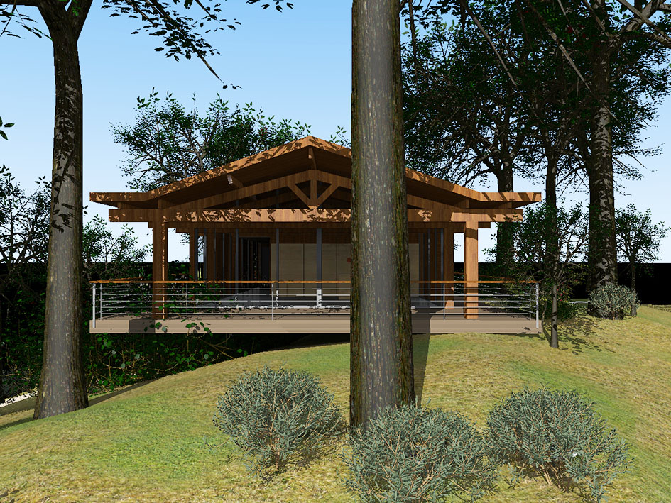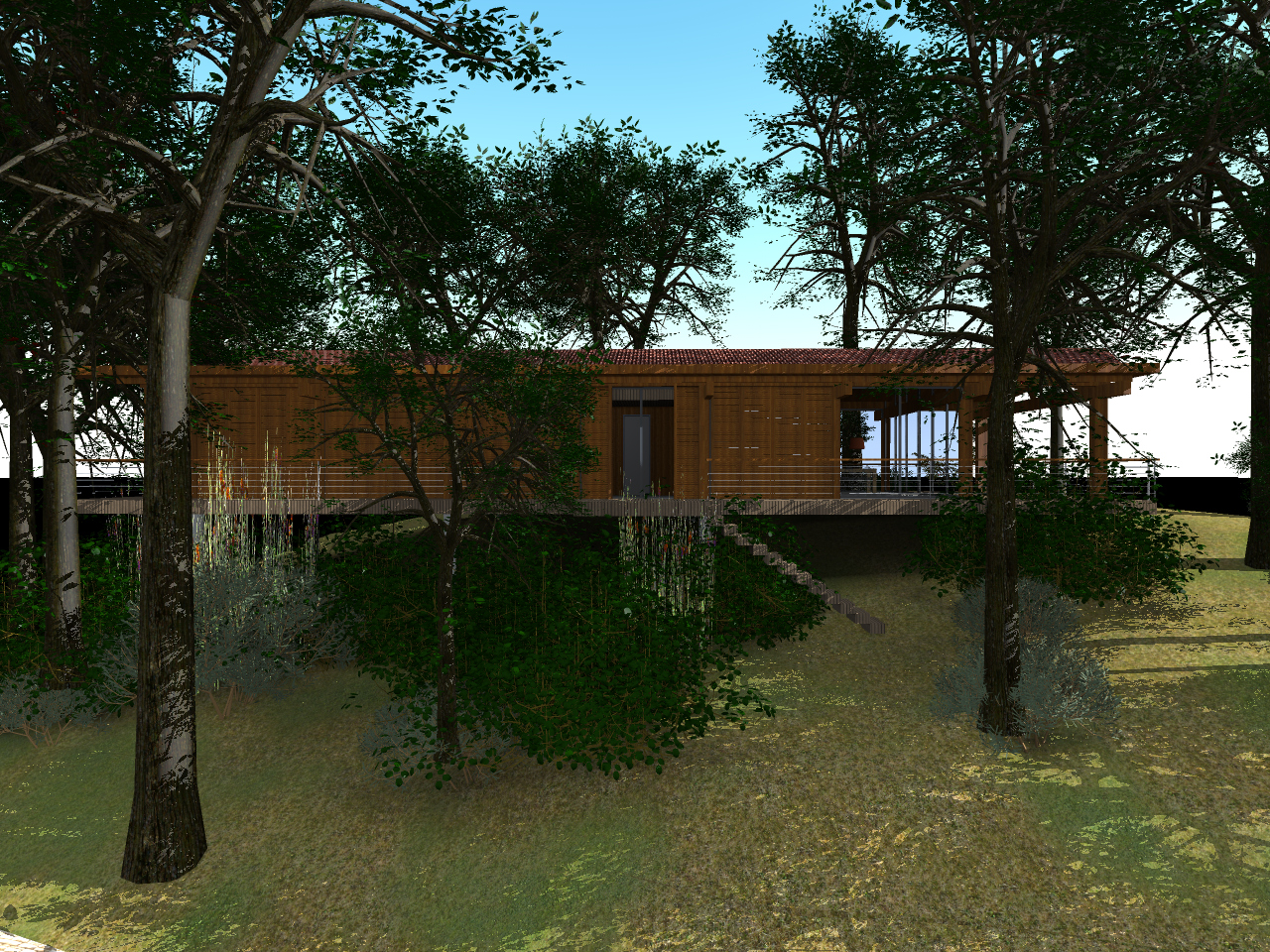 Maison de vacances plain-pied située sur les bords du lac d’Hourtin sur pilotis et entièrement conçue en bois Douglas pour s’intégrer dans le paysage. Toutes les ouvertures de cette maison sur pilotis de 150 m2, équipée d’un salon et de trois chambres, donnent sur une terrasse. Les extérieurs sont protégés par un large avant-toit d’un mètre de large qui permet également une climatisation naturelle des lieux. Cette conception donne la possibilité aux habitants de profiter de l’extérieur quelle que soit la saison et préserve le bois des intempéries.