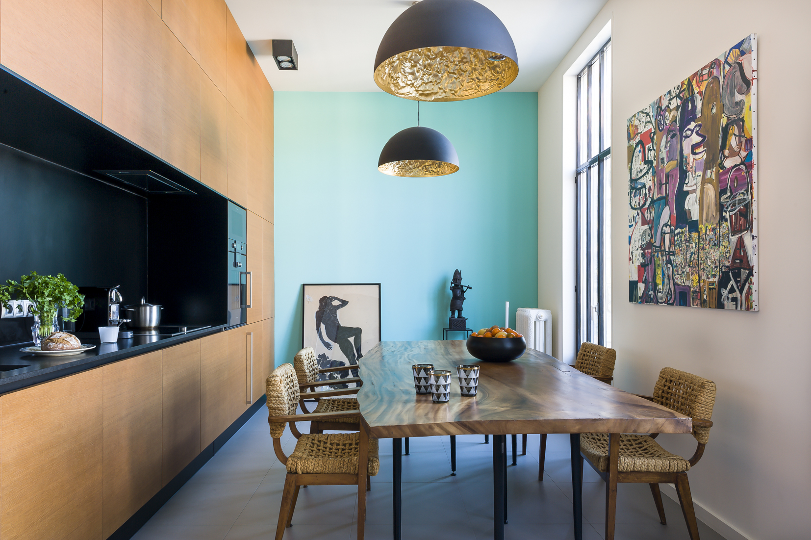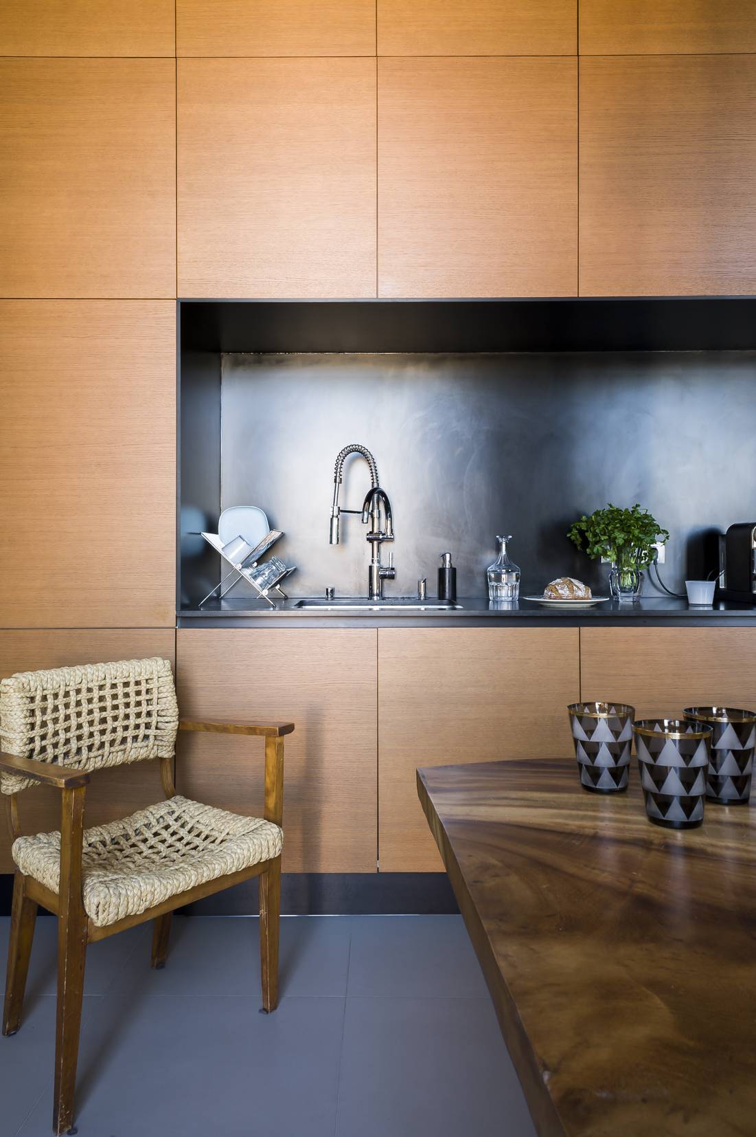 Côté cuisine, de grands carreaux de grès cérame, un meuble en plaque de noyer et un plan de travail en granit noir du Zimbabwe donnent un style épuré à la pièce.