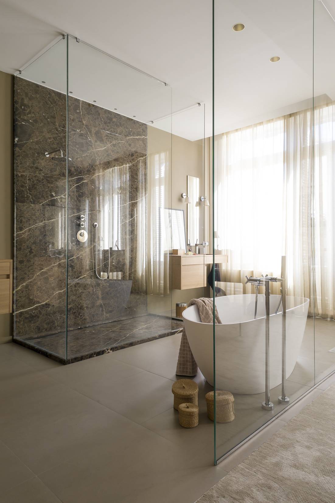 La suite parentale a été pensée comme une pièce unique au sein de laquelle une salle de bain minimaliste s’ouvre sur la chambre, uniquement séparée par des verres de protection. La douche, conçue par le marbrier Duclos, et la baignoire deviennent d’élégants éléments de décoration.
