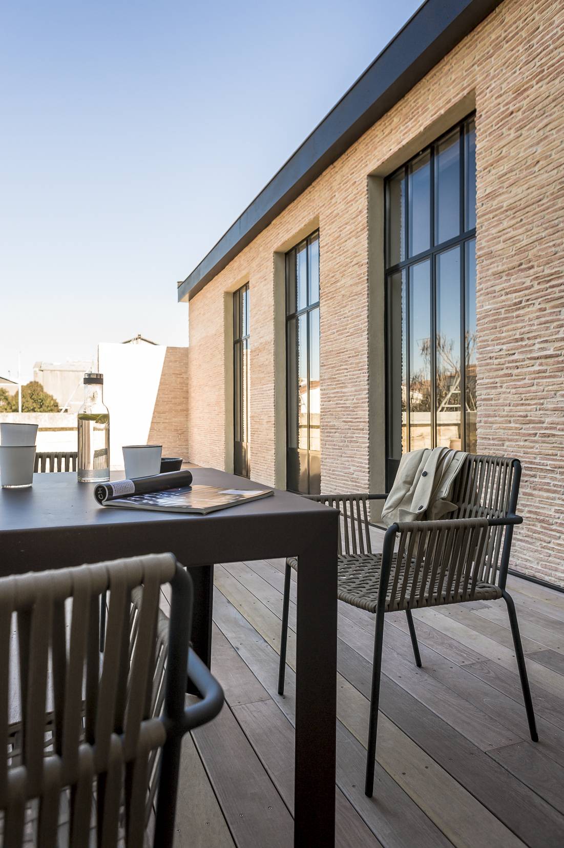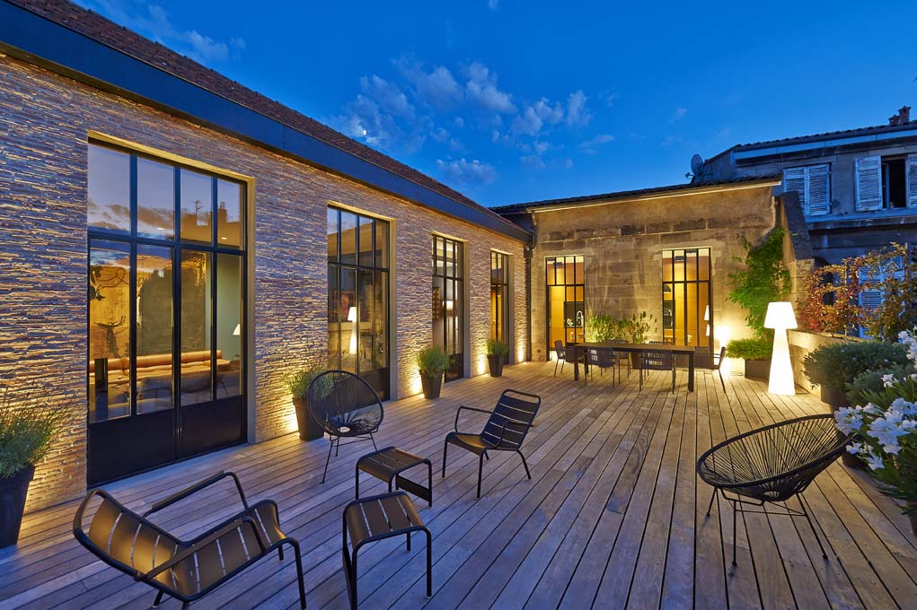 A l’extérieur, nous avons choisi de recouvrir les murs de la terrasse de briquettes fines posées à l’ancienne avec la technique de la corde, afin de faire de la terrasse un espace chaleureux et de créer un contraste avec la pierre blonde d’Aquitaine.Décoration et architecture d'interieur réalisé par Claude de Boyson.