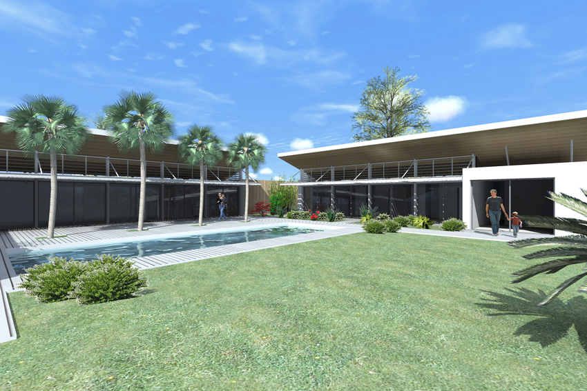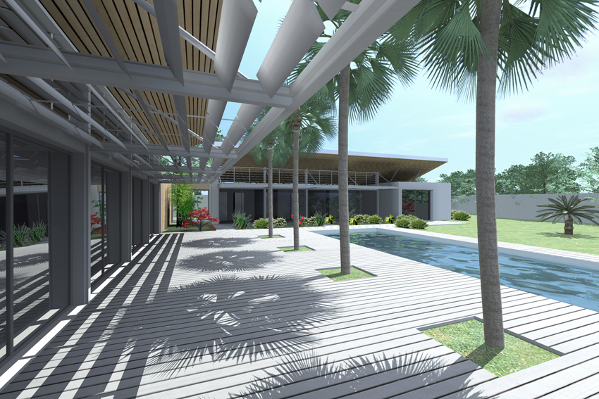 La particularité de cette villa réside dans sa toiture inversée posée sur une structure métal et dont les extrémités font office de protection solaire. Une protection renforcée par l’ajout de brise-soleil tout autour de la piscine.