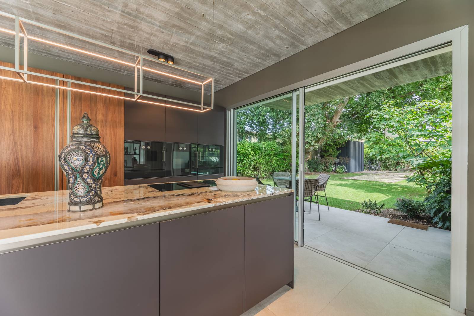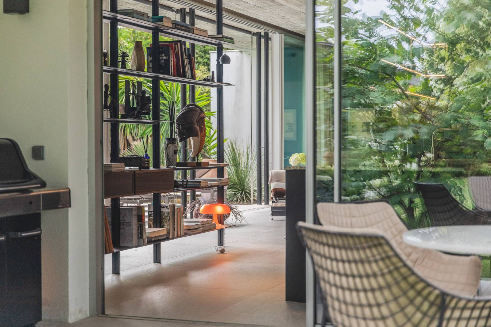 Le sol, habillé d’un carrelage ton pierre identique à l’intérieur comme à l’extérieur, renforce la sensation de continuité. Dans le salon, la hauteur sous plafond atteint 3,30 mètres, amplifiant l’impression d’espace. Un mur entièrement vitré côté jardin, équipé d’une baie motorisée, fait entrer la lumière à flots et efface les frontières entre intérieur et extérieur.