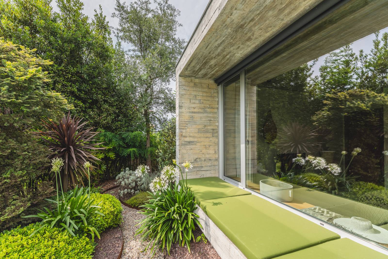 À l’extérieur, le jardin, pensé comme une extension du séjour, utilise des essences locales et des matériaux durables. La terrasse, largement ouverte sur le paysage, assure une continuité visuelle avec la nature environnante.